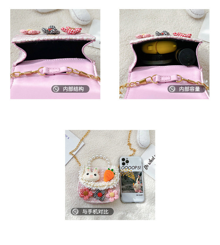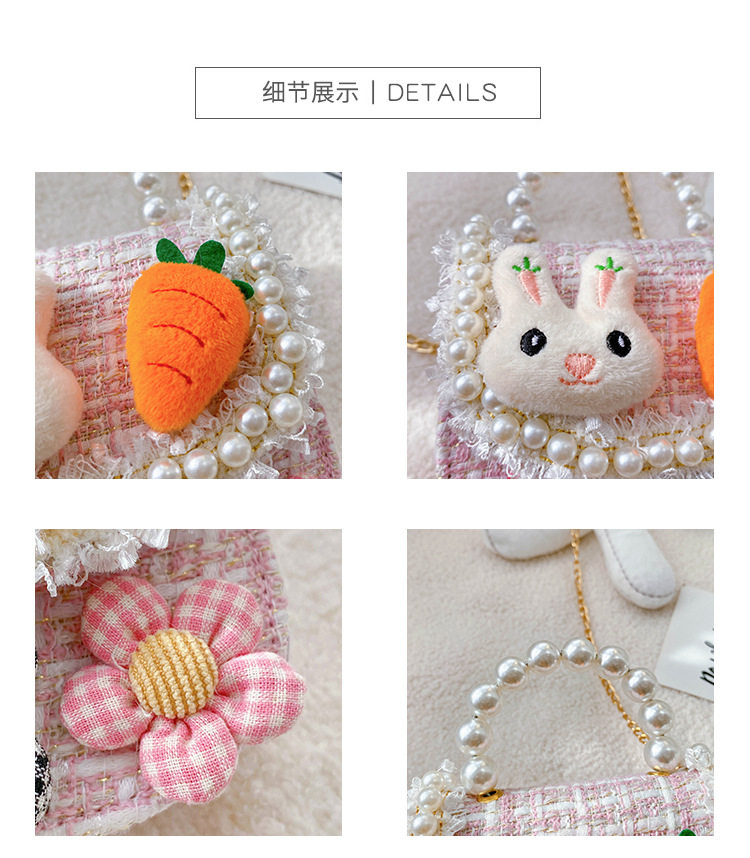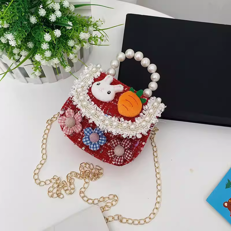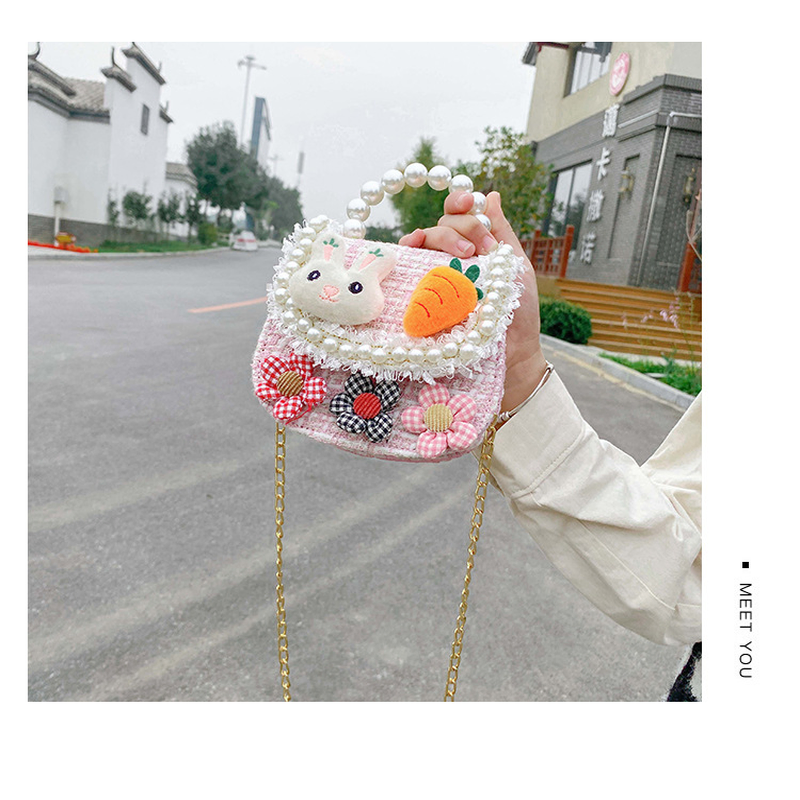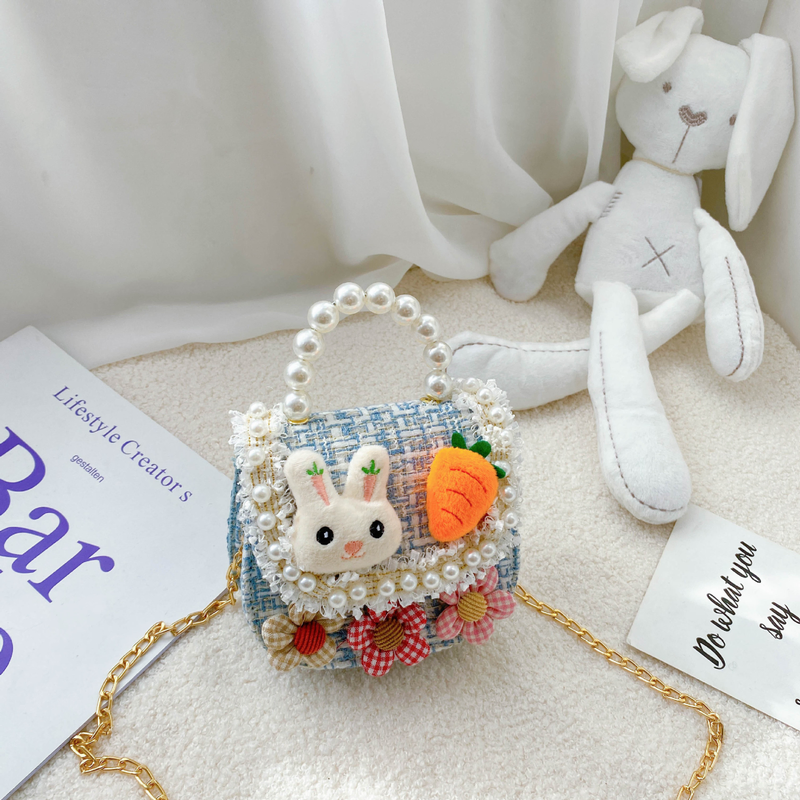 Let her style bloom with this enchanting mini tweed handbag, designed for little ones who love to play dress-up. This structured purse is crafted from a high-quality woven tweed fabric and features a stunning faux-pearl bead handle for a sophisticated touch. The front flap is decorated with a delightful 3D plush bunny head and a vibrant orange carrot, surrounded by a dainty white pearl-like bead trim and delicate lace fringe. Complete with three checkered fabric flowers and a detachable gold-tone chain strap, this versatile bag can be carried by hand or worn as a crossbody for any special occasion.