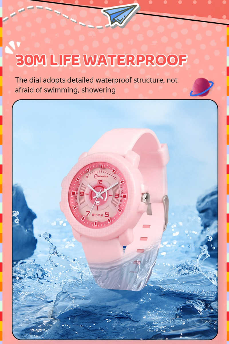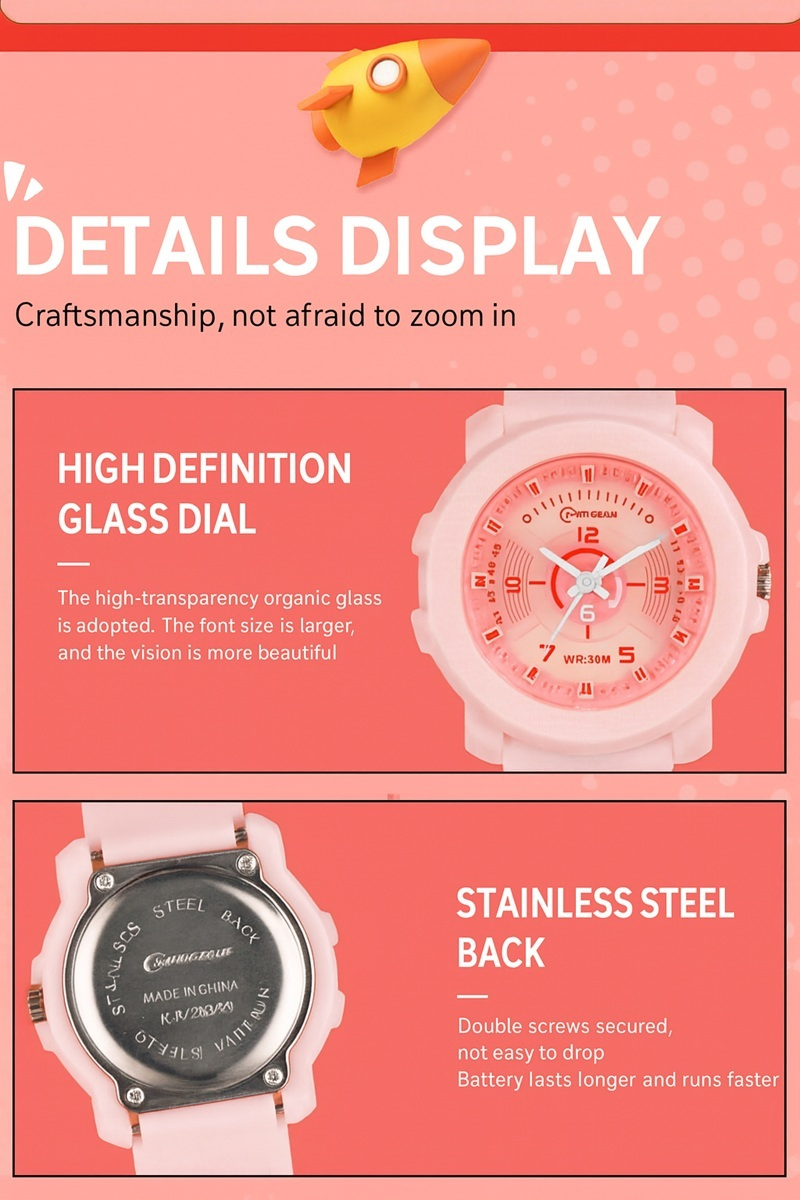 Crafted with a durable silicone strap and a clear analog dial, it’s built for everyday adventures at school or outdoors. The lightweight design ensures comfort, while the bold numerals help kids easily learn to tell time. Stylish, sturdy, and practical—this watch is a must-have for little trendsetters!