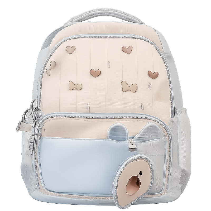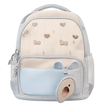 "Adorable and stylish, this pastel blue backpack features a charming bear and bow design, perfect for school or casual outings. Equipped with multiple compartments, it combines practicality with a playful touch, making it an ideal companion for kids and young at heart!"