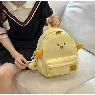 Adorable and lightweight kids backpack designed in a soft chick shape with little wings and a sweet face detail. This mini backpack is perfect for school, travel, daycare, or everyday use. It features a spacious main compartment, a front zip pocket for small essentials, and side pockets for extra convenience. Made with soft yet durable material, it is comfortable for children to carry and adds a fun, playful touch to any outfit.