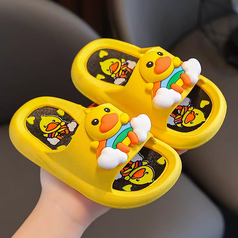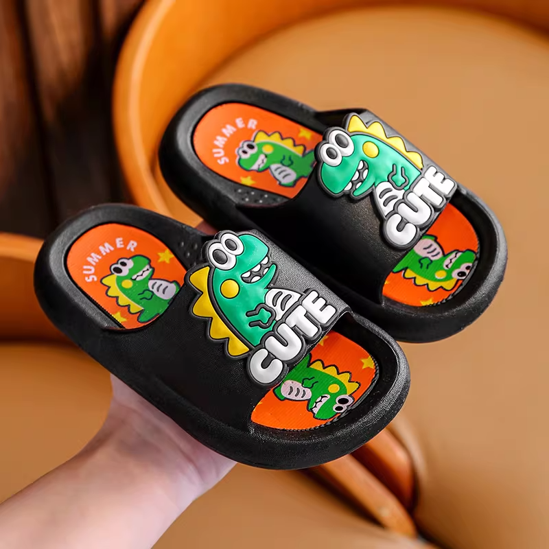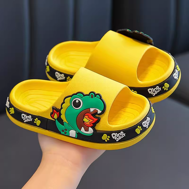 Step into a prehistoric world with these adorable 3D Dinosaur Slides. Designed to spark joy, each sandal features a large, friendly 3D dinosaur head with big white eyes and bright yellow spikes that "pop" right off the strap. The footbed is intricately detailed with a "FASHION" logo and cute dinosaur character prints, providing a textured surface for comfort. Crafted from lightweight, durable material, these slides are ideal for the pool, beach, or as fun everyday house slippers for boys and girls.