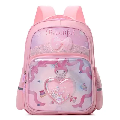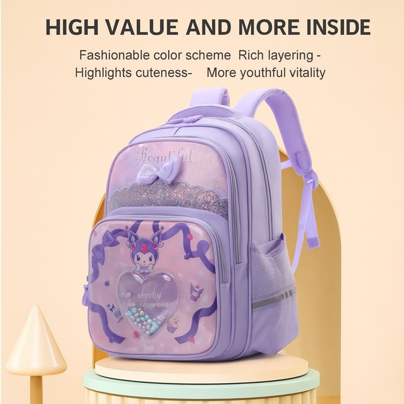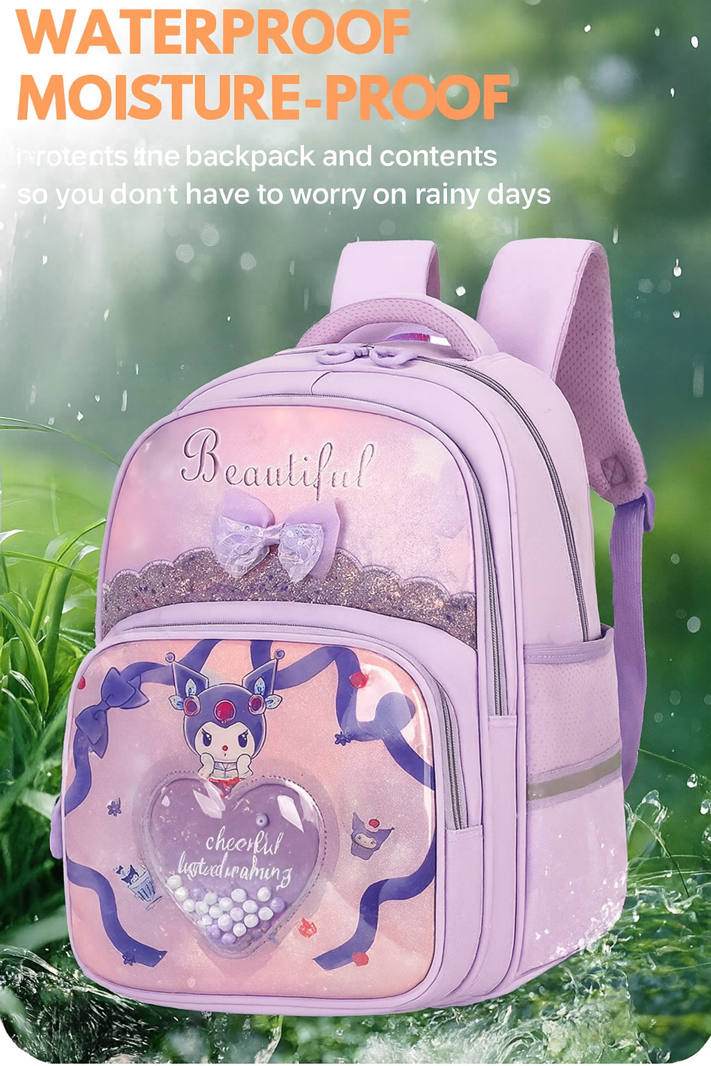 Designed especially for little girls, this backpack features a beautiful pastel design, sparkling glitter details, a cute cartoon character print, and a charming 3D bow & heart-shaped shaker pocket filled with colorful beads that kids absolutely love.