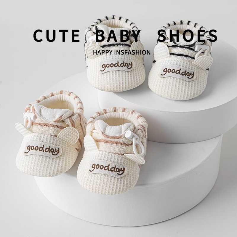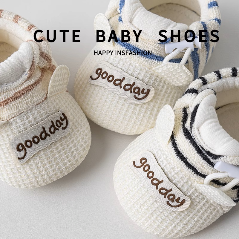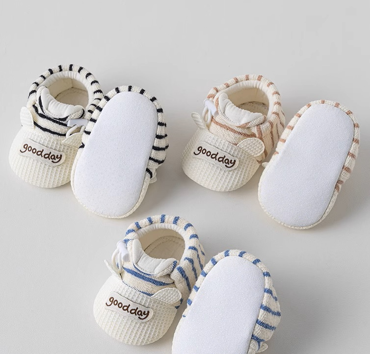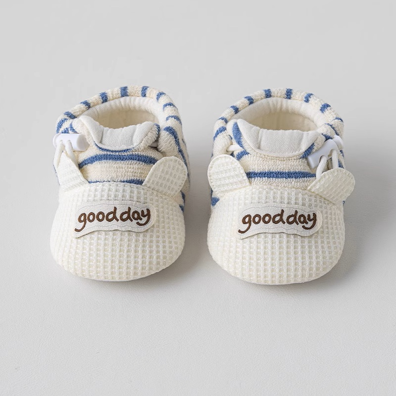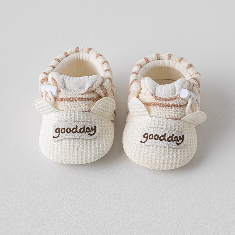 The soft striped pattern and embroidered “good day” detail make them irresistibly cute — perfect for newborns, crawlers, and early walkers.