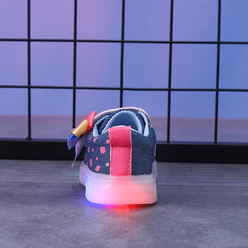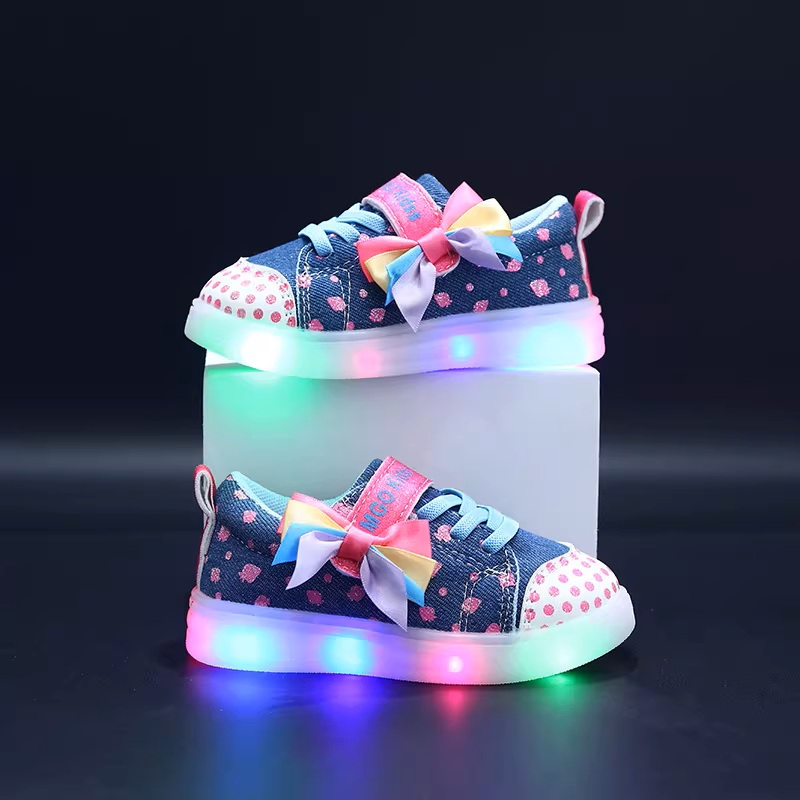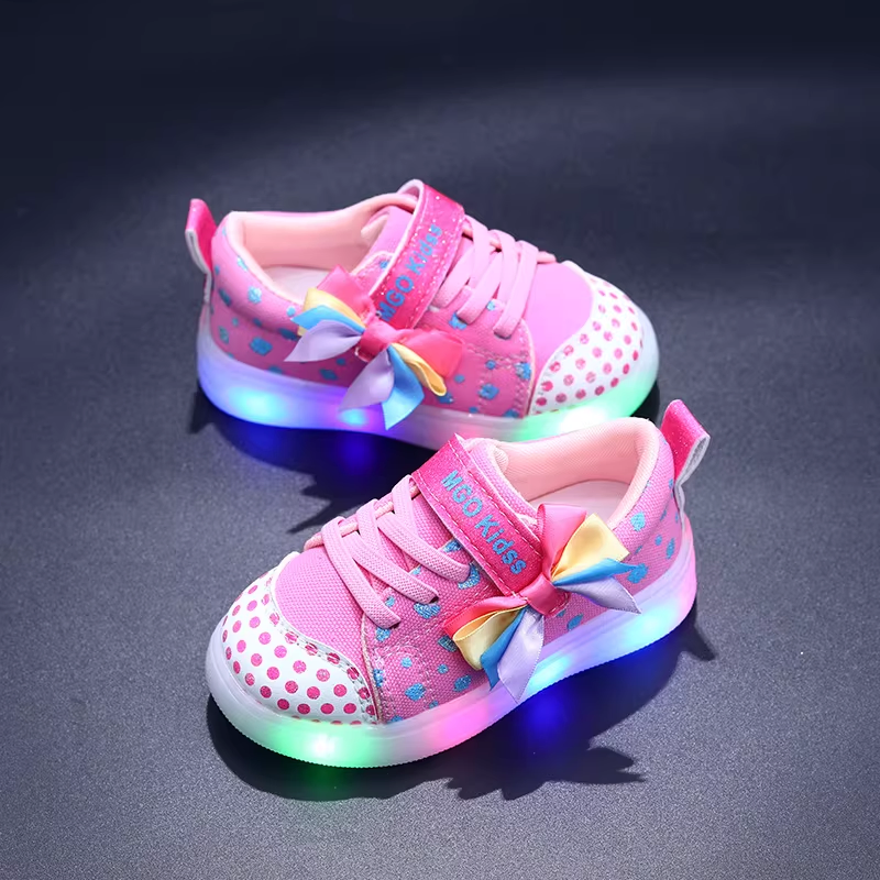Transform every sidewalk into a dance floor with these dazzling light-up sneakers. Each shoe features a vibrant multi-colored LED sole that flashes in shades of green, blue, and pink with every step she takes. The charming design includes a large, satin rainbow bow on the side and a playful polka-dot pattern on the reinforced toe cap and upper. With an easy-to-use Velcro strap branded with "MGO Kids," these sneakers offer the perfect mix of independence for her and peace of mind for you.