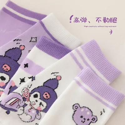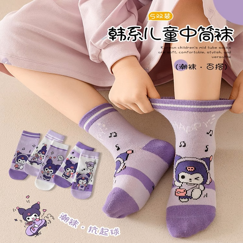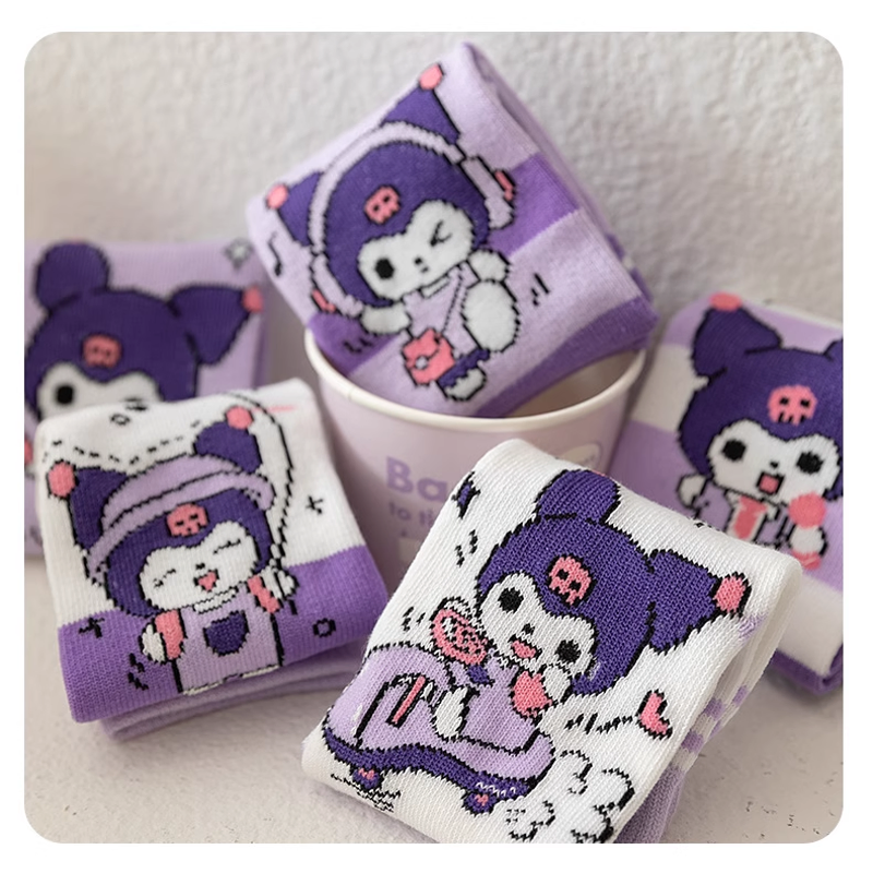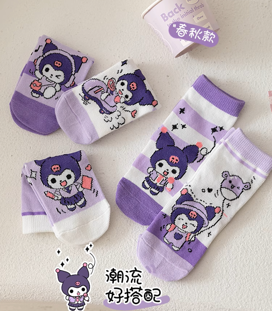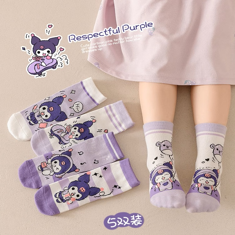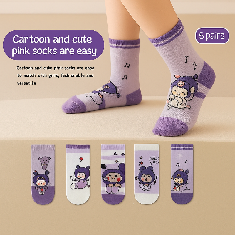 These soft and breathable socks feature adorable cartoon-style prints in vibrant purple and white tones. Designed to keep little feet warm and comfortable, the stretchable cotton blend ensures a perfect fit for daily wear.