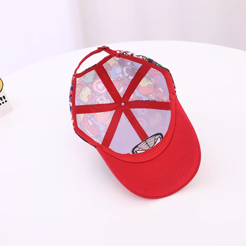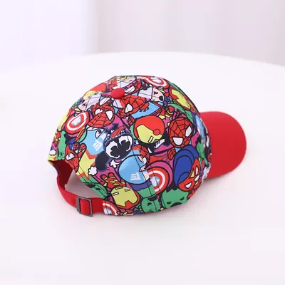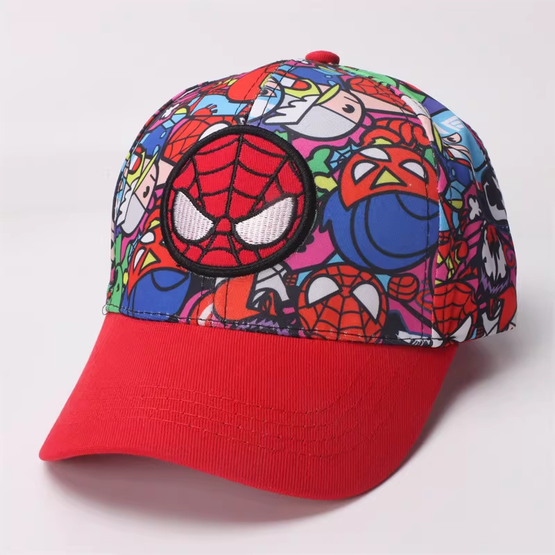 Let your child swing into action with this bold and colorful Spider-Man baseball cap. Featuring a high-energy, all-over print of various Spider-Man poses and comic-style graphics, this hat is a visual feast for Marvel fans. The front is anchored by a high-quality, thickly embroidered Spider-Man mask patch that stands out against the busy background. With its classic solid red curved brim and durable construction, this cap provides both heroic style and practical sun protection for every daily adventure.