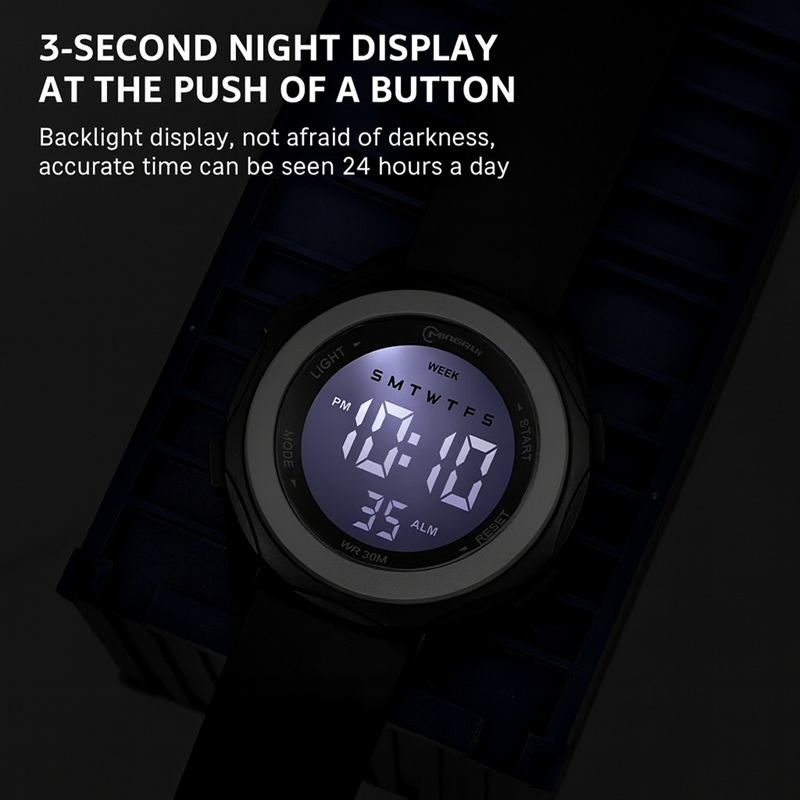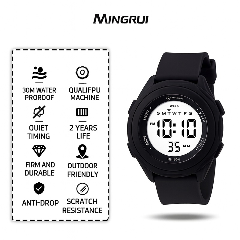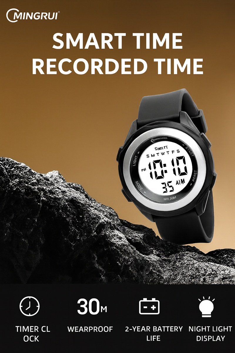 Take on every adventure with the Mingrui Waterproof Digital Sports Watch, built for toughness, precision, and lasting performance. Designed with a sporty edge, this digital wristwatch features 30M water resistance, shock and scratch protection, and quiet timing technology — perfect for both indoor and outdoor use.