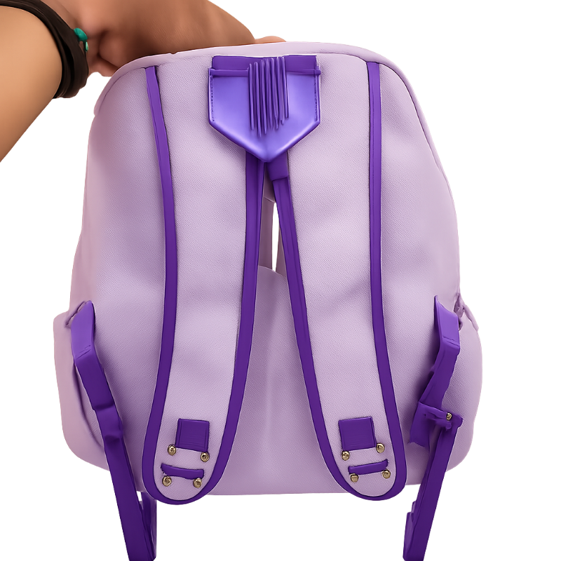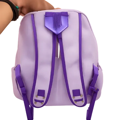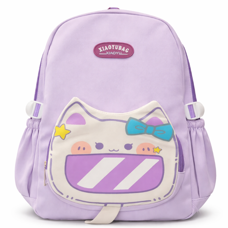 : A pastel purple backpack featuring an adorable, kawaii-style cartoon cat on the front. The cat has a cute bow on its head and a smiling face, with a striped candy-like design across its body. The bag is branded with the "XIAOYUBAG" label on top, and its overall soft, playful design is perfect for a youthful, fun look. The backpack includes white side straps and a main zipper for accessibility.SIZE-LONG-16 INCH -SIDE 13 INCH